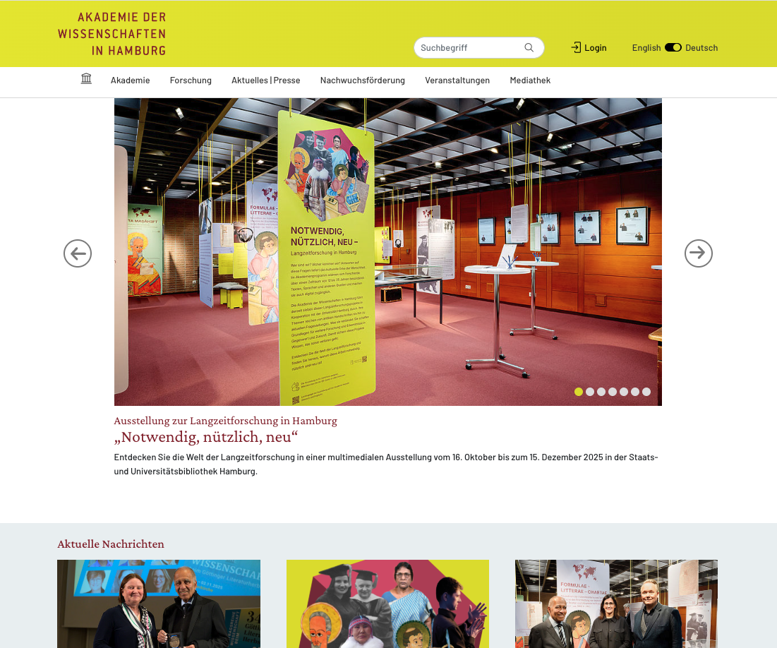 Seit 2020 betreuen wir die Akademie mit Komplettrelaunch, Design-Entwicklung und kontinuierlicher Optimierung (2024 erfolgte ein umfassender Rebrush). Das Fundament bilden speziel entwickelte und konfigurierte TYPO3-Extensions, die exakt auf die Bedürfnisse einer wissenschaftlichen Institution zugeschnitten sind: