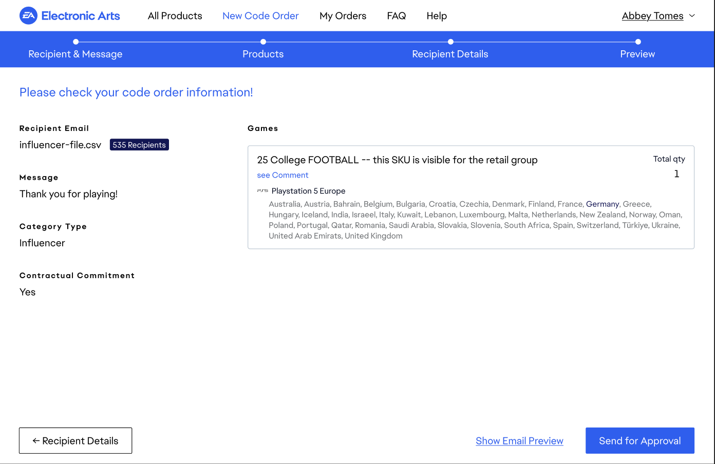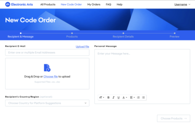 Die Aufgabe: Ein Bestellsystem für Gamecodes entwickeln, das weltweit von Influencern, Partnern und EA-Mitarbeitern genutzt wird. Jeder, der von EA einen Code zur kostenlosen Nutzung eines Spiels erhält, durchläuft das von uns entwickelte System. Das System muss zwei Nutzergruppen abbilden: